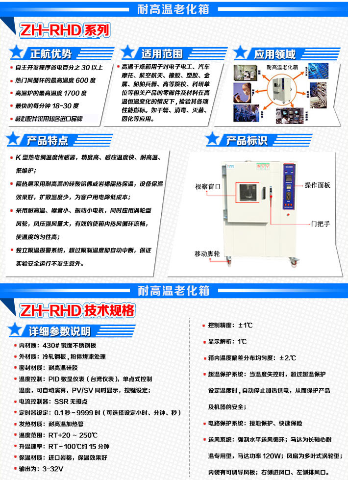 用于對電子電工、汽車摩托、航空航天、橡膠、塑膠、金屬、船舶兵器、高等院校、科研單位等相關產品的零部件及材料在高溫恒溫變化的情況下,檢驗其各項性能指標。嚴格按GB/T2423.2-2008高溫老化試驗方法制造。