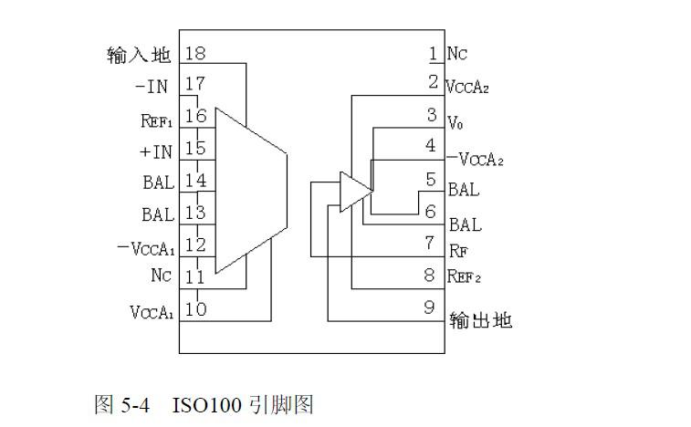 由于環(huán)境試驗箱的工作環(huán)境十分惡劣,因此輸入通道的各個環(huán)節(jié)中存在各種電磁干擾以及共模干擾等不良因素,會造成測量信號嚴(yán)重失真,系統(tǒng)不穩(wěn)定等后果。特別是存在強電干擾時會直接影響系統(tǒng)的安全。為此,在輸入通道中常常采用信號隔離措施。常用的方法是采用隔離放大器。這是因為隔離放大器的線性和穩(wěn)定性好,隔離電壓和共模抑制比高,應(yīng)用電路簡單,頻帶較寬等。本設(shè)計中采用了ISO100光耦合隔離放大器保證前向通道的信號傳輸質(zhì)量ISO100 是一種小型廉價的光耦合隔離放大器。其工作電源為±18V,隔離電壓2500V,輸入電流為±1mA,頻帶寬達(dá)60kHz,為18 引腳DIP 組件。引腳圖如圖5-4 所示: